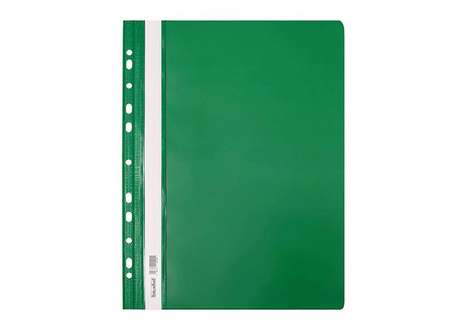 Skoroszyt wykonany z mocnego, sztywnego PCV. Przednia okładka przezroczysta, twarda, tylna kolorowa. Papierowy pasek do opisu, zaokrąglone rogi obu okładek, boczna perforacja umożliwiająca wpięcie do segregatora z dowolnym ringiem.